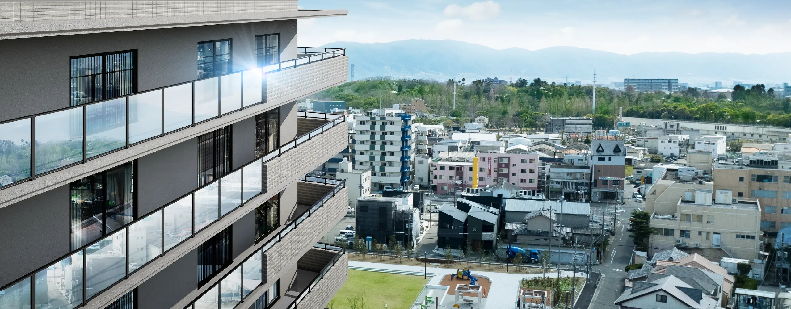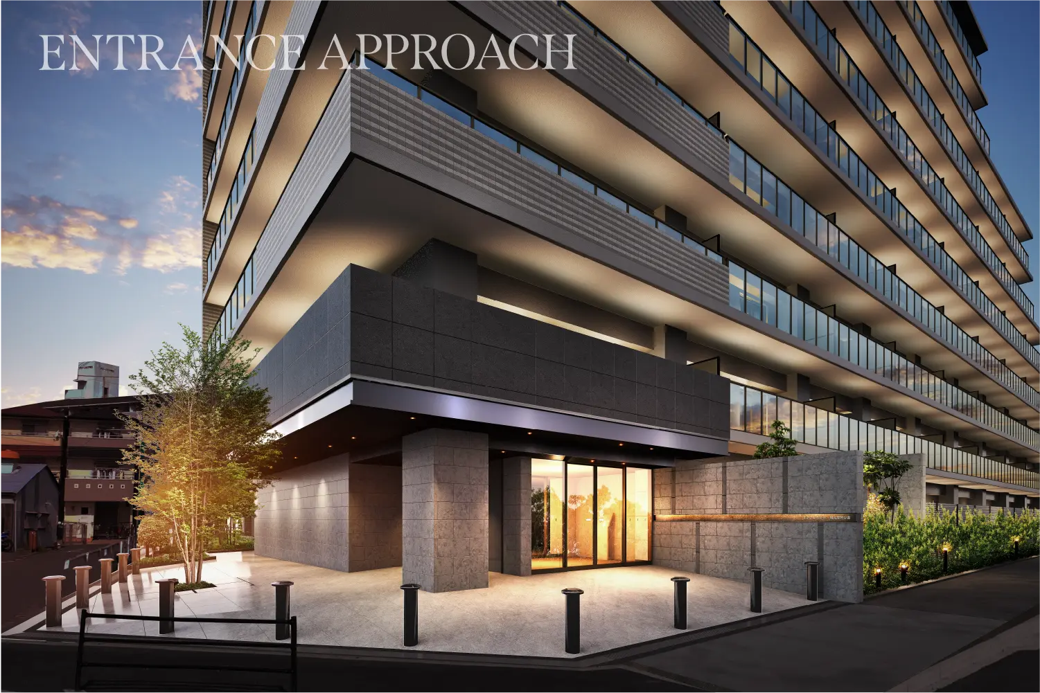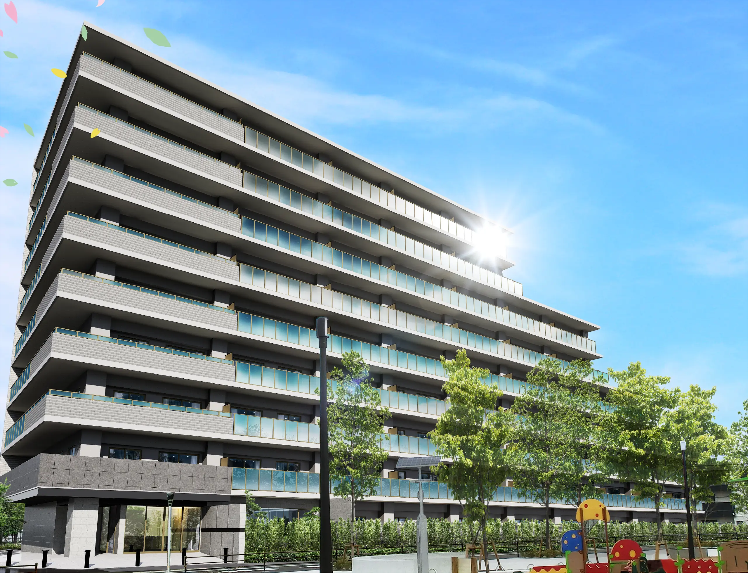 - ※掲載の外観完成予想図、エントランスアプローチ完成予想図、眺望合成外観完成予想図は計画段階の図面を基に描き起こしたものに、現地周辺写真(2024年3月撮影)を合成加工したもので、実際とは多少異なります。また、樹木は成長した状態の予想図であり、描かれた状態に成長するまで、一定期間必要となります。