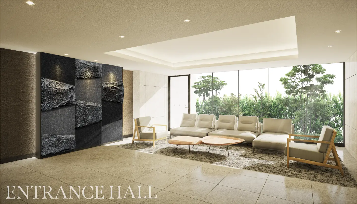 エントランスは光で空間の流れを演出、アイストップとなる箇所には間接照明を配置することで明るくも落ち着いた印象に。ロビーからガラス越しに美しい緑と明るい日差しを満喫できるテラスは、自然美あふれる邸宅を創造します。