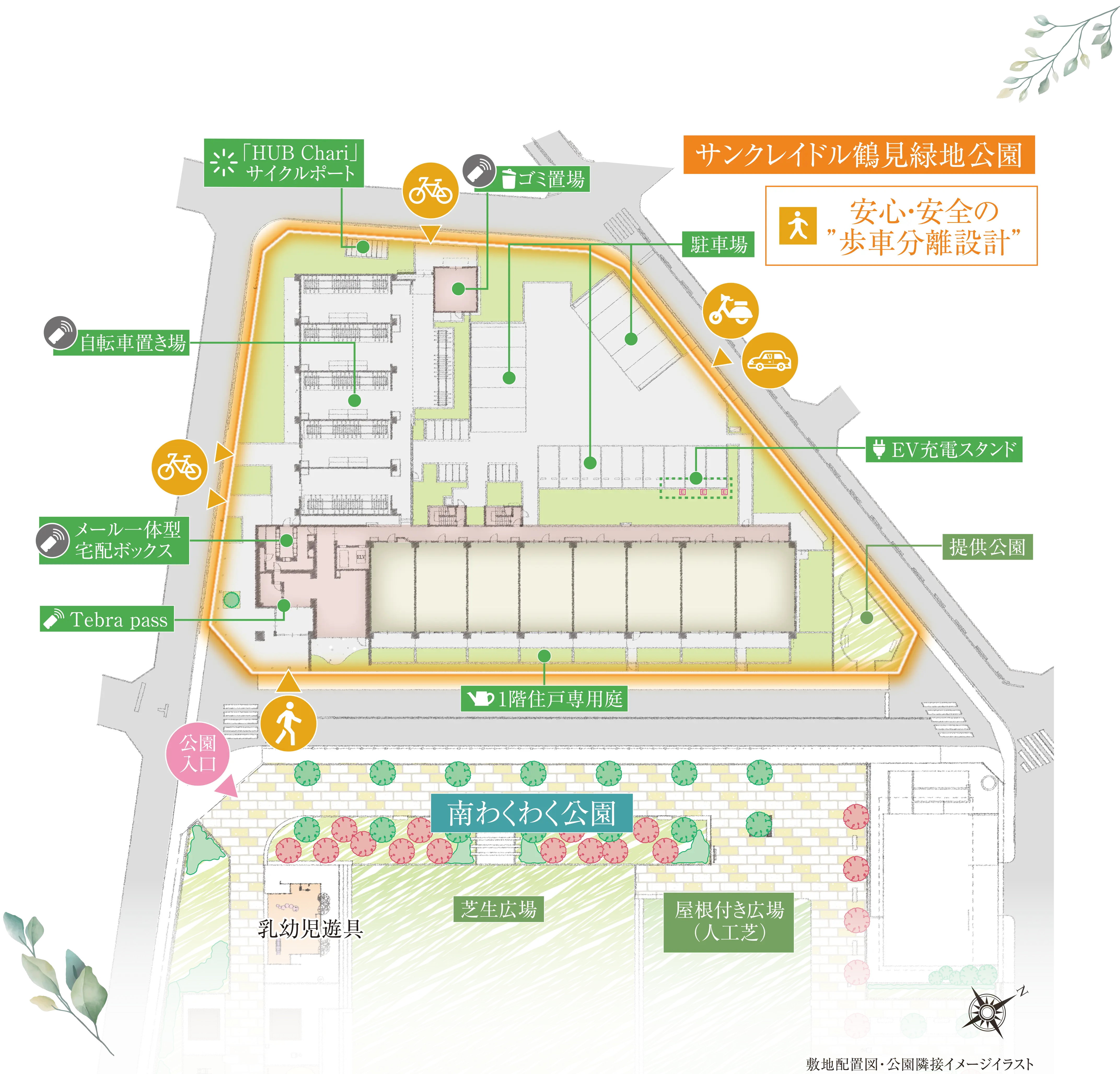- ※掲載の敷地配置図・公園隣接イメージイラストは計画段階の図面を基に描き起こしたもので、実際とは多少異なります。
