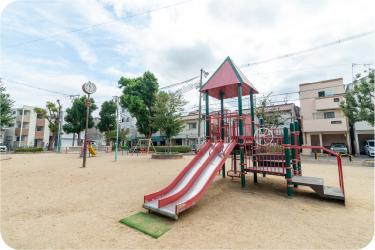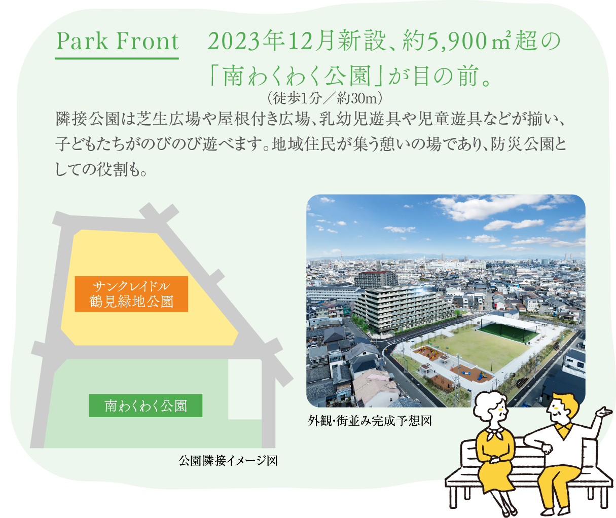 - ※掲載の公園隣接イメージ図は本件の立地環境を概念的に描いたもので実際とは多少異なります。また、イメージイラストのため、各種施設などの距離感は多少異なります。