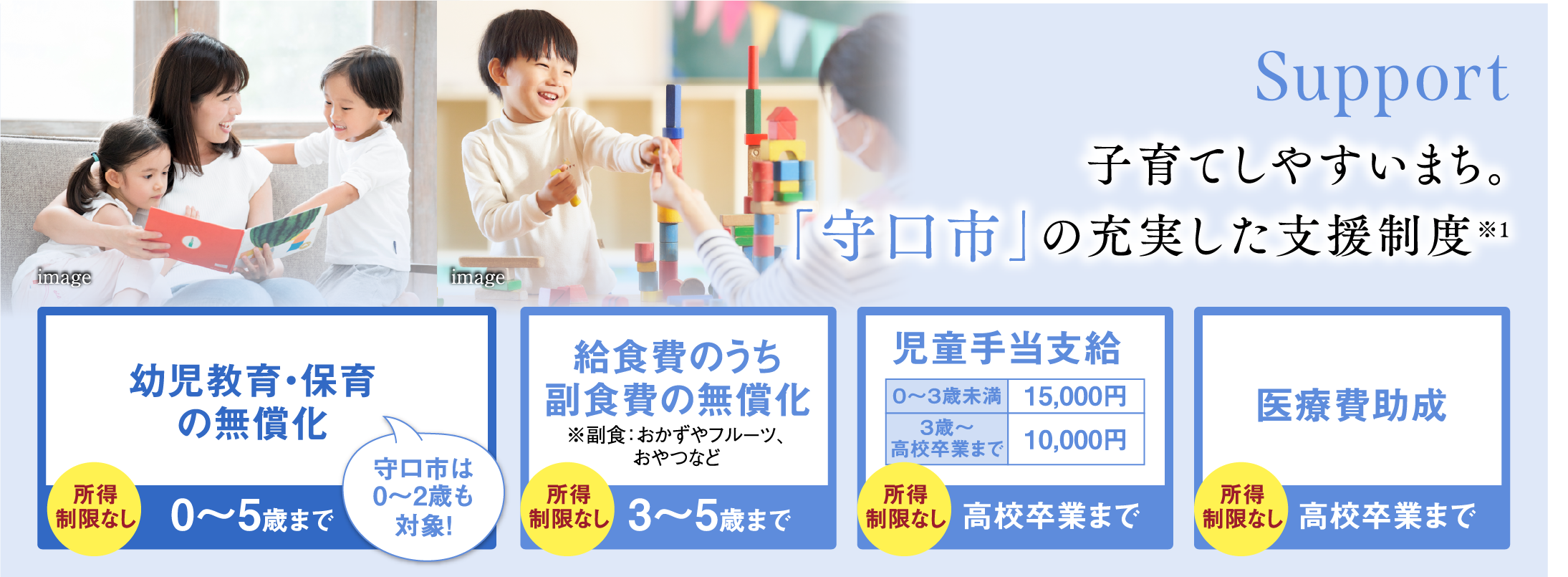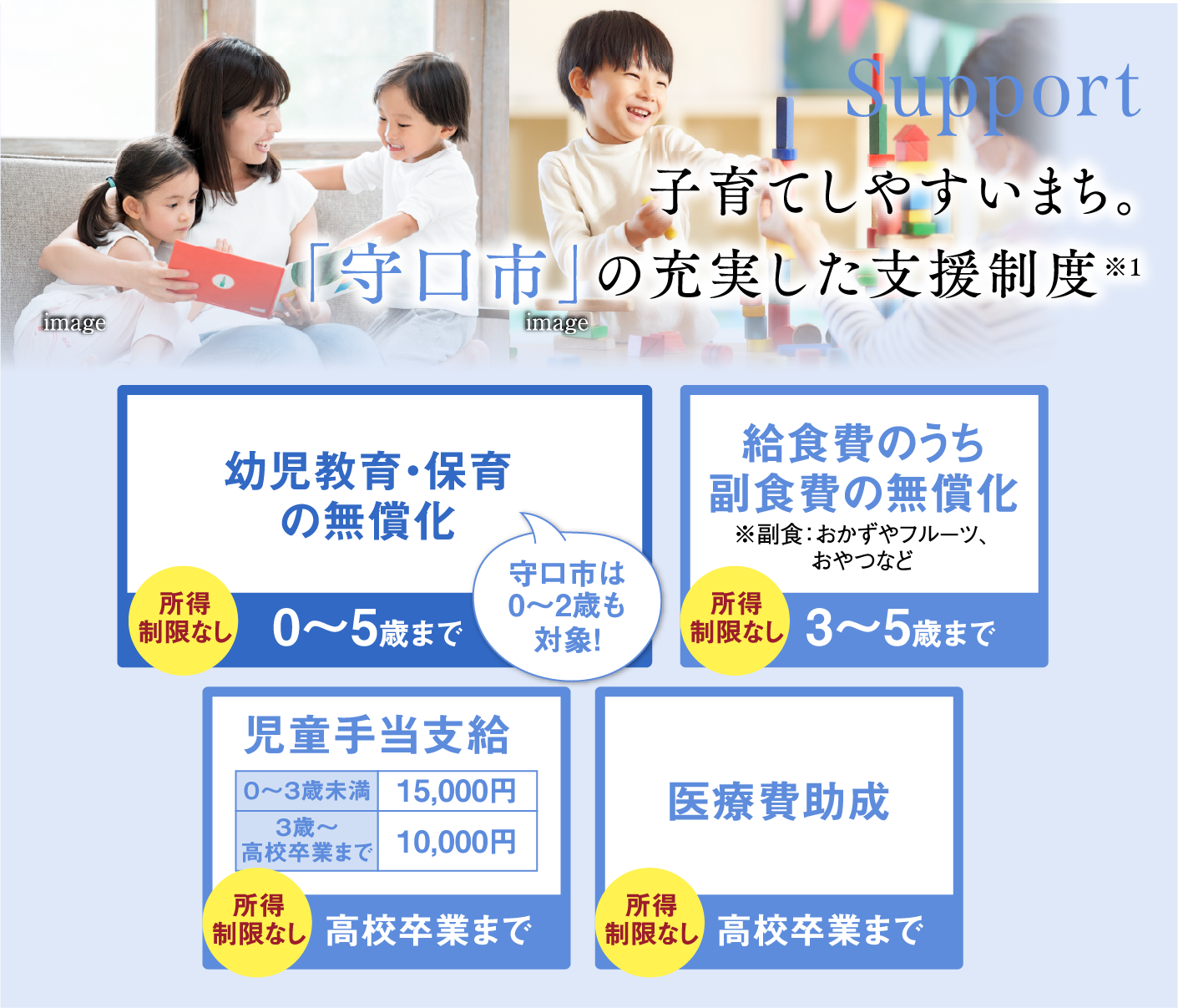 - ※1.子育て支援制度の適用には一定の条件があります。詳しくは守口市ホームページ(https://www.city.moriguchi.osaka.jp/)でご確認ください。子育て支援制度の情報は2025年7月現在のものであり、今後変更となる場合があります。